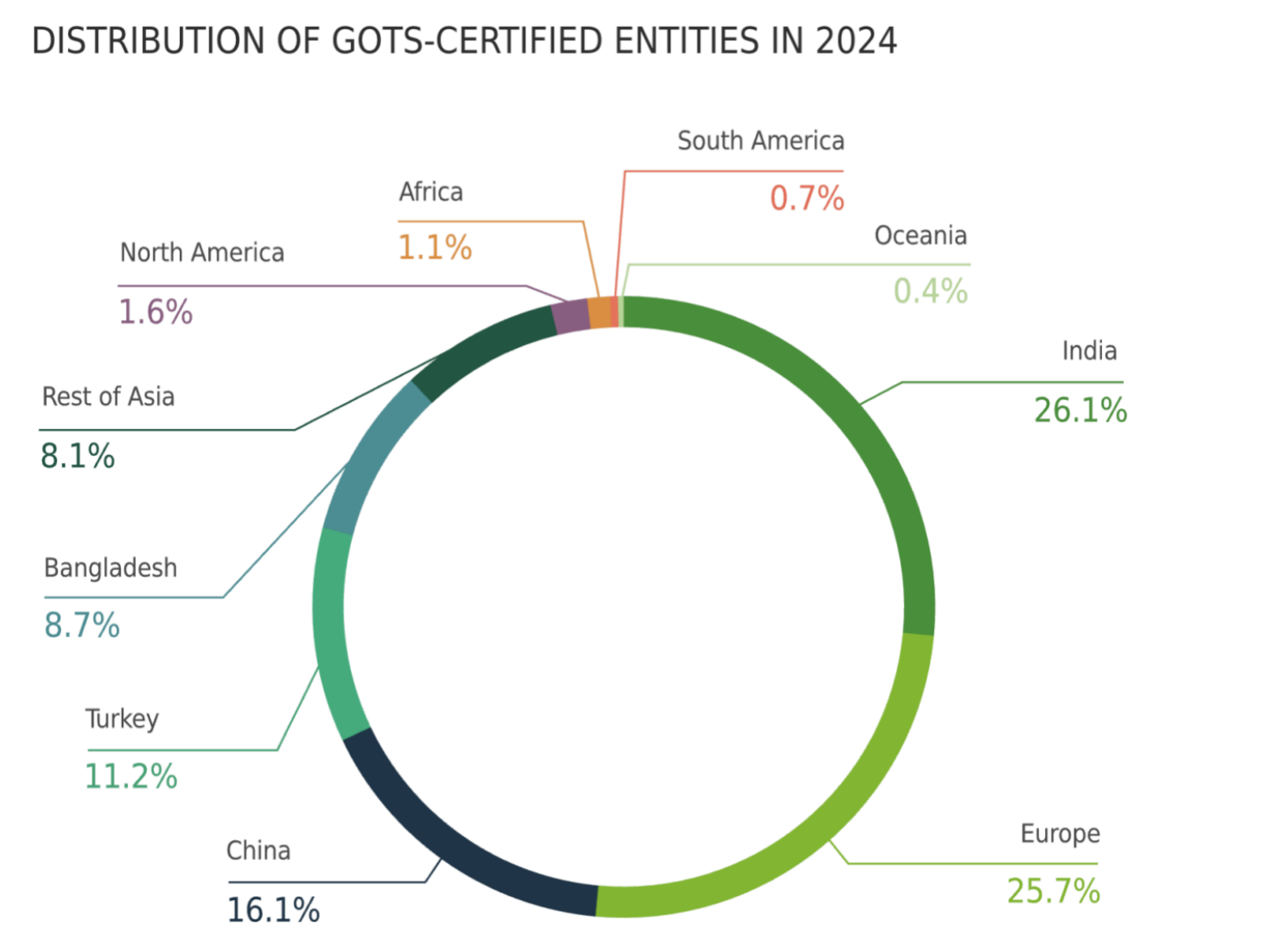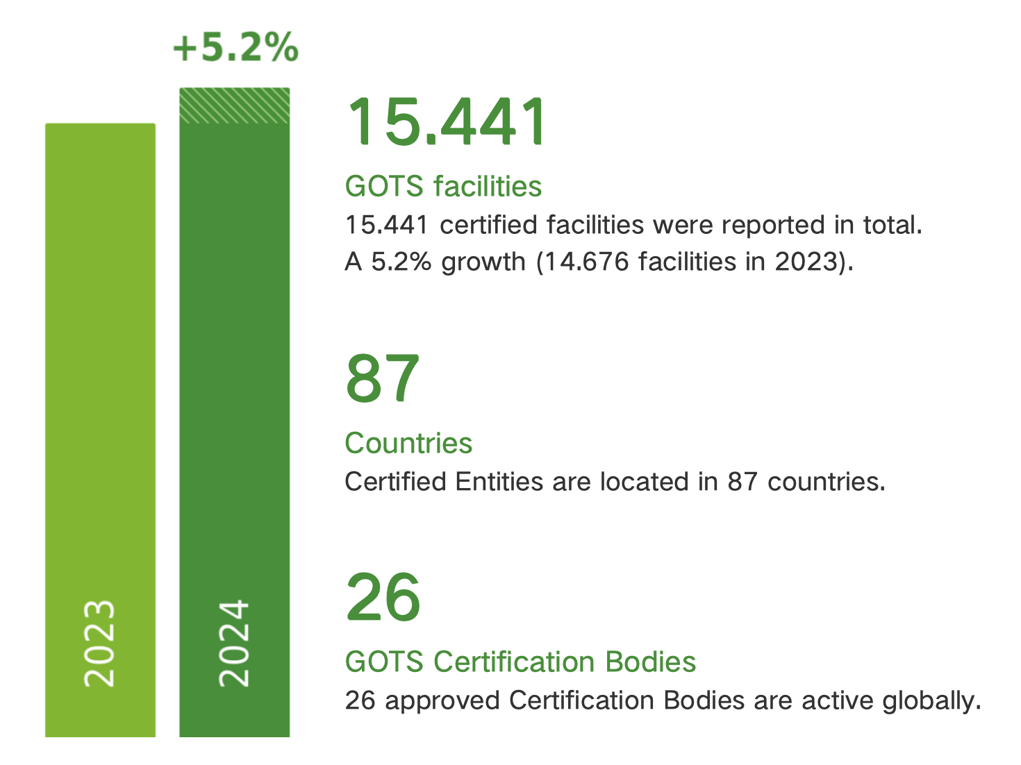 2024年GOTS认证场所数量达到15,441个,与2023年的14,676家相比,增长了5.2%。这些被认证实体分布在87个国家,显示了GOTS在全球范围内的广泛影响力。同时,全球共有26家获批准的认证机构在开展GOTS认证业务。