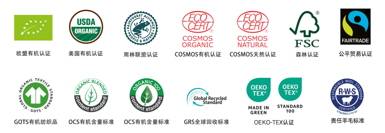 - 纺织品领域的GOTS全球有机纺织品标准认证、OCS有机含量标准认证、GRS全球回收标准认证、RCS回收声明标准认证、OEKO-TEX认证、RWS负责任羊毛标准认证;